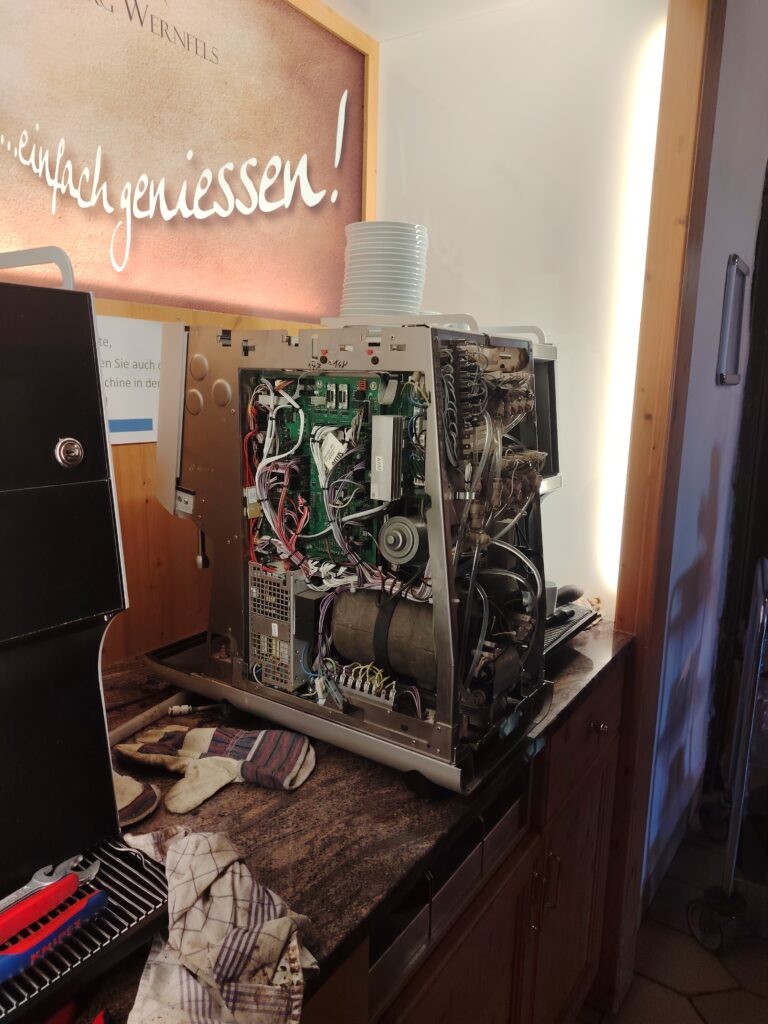 Wobei: Ob das Turnier so lange weitergeführt werden kann, steht noch in den Sternen. Die Schiedsrichter denken über eine sofortige Abreise nach. Schon bei der Anreise war eine Kaffeemaschine kaputt, was für großes Gedränge an der verbliebenen Maschine sorgte. Die Reparatur war nur kurzzeitig erfolgreich, und nun sind (oh Schreck!) beide intelligenten Kaffeeproduzenten außer Betrieb. Beim Blick auf das Innenleben, das eher wie ein Borg-Raumschiff aussieht, hat man das Gefühl, es könnte noch ein Weilchen dauern, bis sie wieder funktionieren. Bitte Daumen drücken! Es wäre schade, wenn wir das Turnier wegen Mangels an qualitativ hochwertigen Heißgetränken beenden müssten.