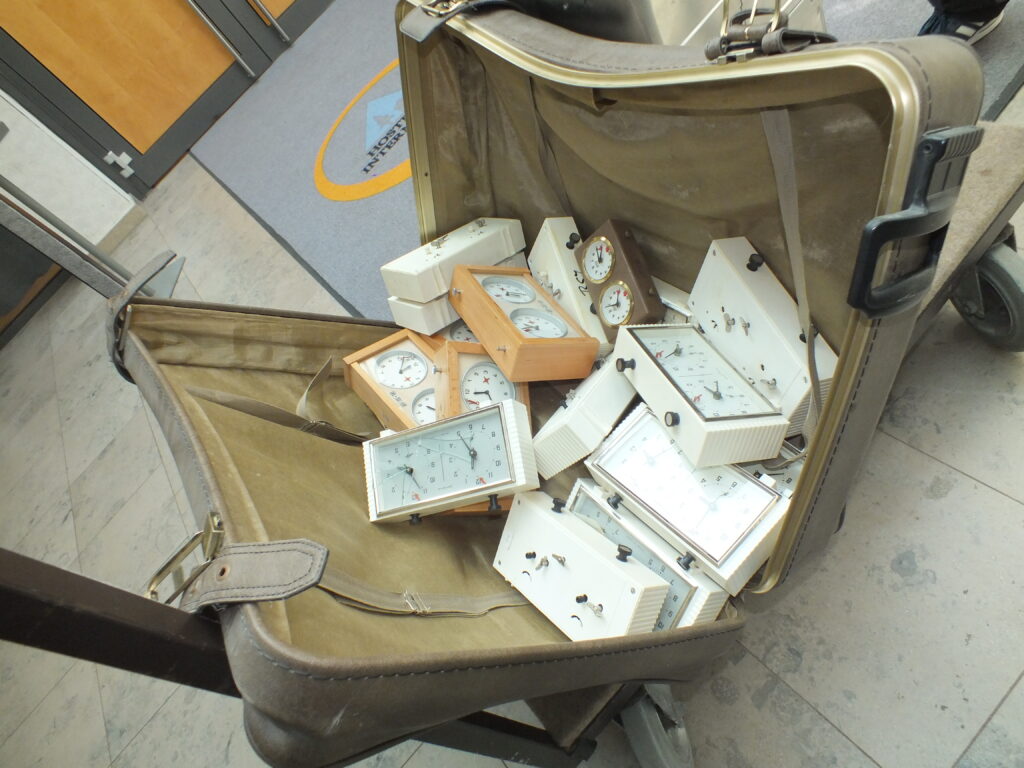 Auch die Mädchenreferentin scheint angesichts des herannahenden Endes des Turniers von großer Emsigkeit befallen zu sein. Es wird sortiert, gepackt und beschriftet. Die gammligen analogen und defekten Schachuhren waren samt historischem Aufbewahrungskoffer eigentlich dem Sperrmüll geweiht. Die letzten Tage hatten weitere anachronistische Stücke in ihren Kartons noch munter im Schiedsrichterkabuff vor sich hin getickert, sodass man als Schiedsrichter und Betreuer jeden Morgen wieder dachte: „Irgendwas explodiert hier gleich.“ Aber es kam ganz anders als gedacht: Auf dem Weg zur (von der Burg genehmigten) Müllablage im Müllhäuschen fanden alle noch funktionierenden historischen Uhren blitzartig Abnehmer. So mancher Schachspielerinnenhaushalt bekommt jetzt ein neues historisches Accessoire für das Wohnzimmer. Und es sind trotzdem noch zwei Kartons voller antiker Stücke vorhanden, die nun fröhlich im Auto der Mädchenreferentin vor sich hin tickern.