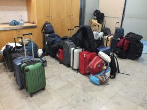 Da die Tischtennishalle wegen der Hallenbauarbeiten nicht gut begehbar ist, werden die Koffer und Taschen vor dem Spielsaal gelagert – mit einem ausgeklügelten System, damit auch die hinteren noch eine Chance haben, irgendwie an ihr Gepäck zu kommen.